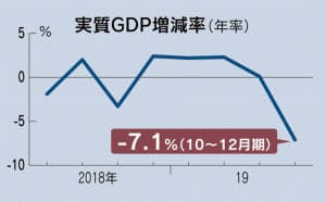 内閣府が9日発表した2019年10~12月期の国内総生産(GDP)改定値は、物価変動を除いた実質で前期比1.8%減、年率換算で7.1%減だった。速報値(前期比1.6%減、年率6.3%減)から下方修正され、前回の消費税率引き上げ直後にあたる14年4~6月期(年率で7.4%減)以来の下げ幅となった。