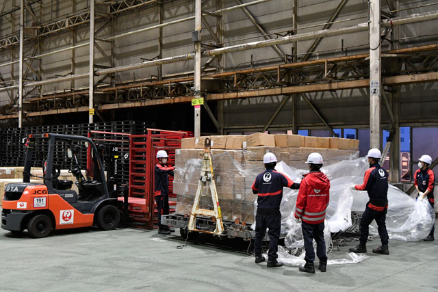 貨物専用便の上海発JL876便が成田へ運んできたマスクが入った段ボールを積み換えるJALの係員=20年4月17日 PHOTO: Tadayuki YOSHIKAWA/Aviation Wire