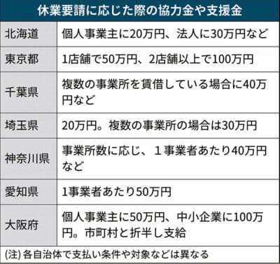 東京都や大阪府などで、休業や時短営業の要請に応じた事業者への協力金の支給が始まる。各自治体は迅速な支給を掲げる一方、事業者に休業状況を示す写真や誓約書など複数の書類の提出や、税理士ら専門家の事前確認などを求めている。緊急事態宣言の期限延長で休業が長期に及び、資金繰りに苦しむ事業者は多く、手続きの迅速化を求める声があがる。