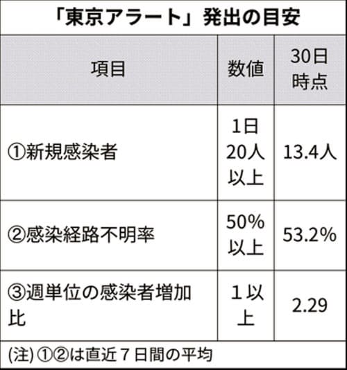 東京アラートは(1)1日の新規感染者が直近7日間の平均で20人未満(2)感染経路不明者の割合が50%未満(3)週単位の感染者が減少――の3つが主な基準。1つでも達成できない場合、医療体制など他の4つの指標も考慮して発令を検討する。