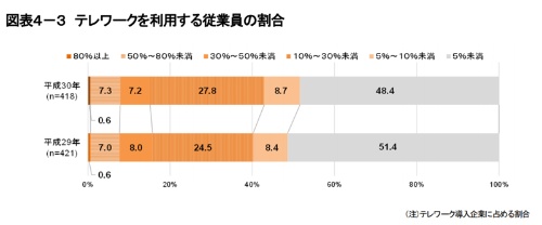 また、もう1つ注目すべき数字は、「テレワークを利用する従業員の割合」である。導入している企業であっても、利用している従業員が5%未満の企業が48.4%となっている(この数字は在宅勤務に限っていない)。