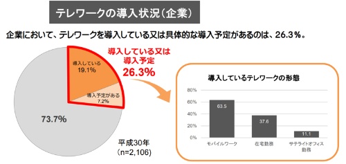 一方、個人への質問によると、「企業等に勤める15歳以上の個人のうち、テレワークを実施したことがあると回答した個人の割合は8.5%となっており、実施したテレワークの形態については、『在宅』の割合が61.9%」となっている。