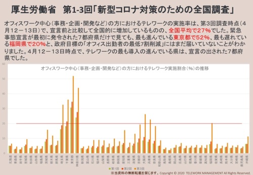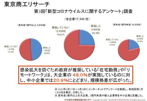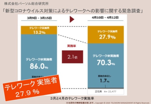 調査期間、調査地域、調査対象などが異なるため一概には言えないが、緊急事態宣言下においては、大企業や都市部では50%を超える企業や社員が在宅勤務を実施、全国ベースでは約3割の企業が「在宅勤務」を実施したと考えられる。