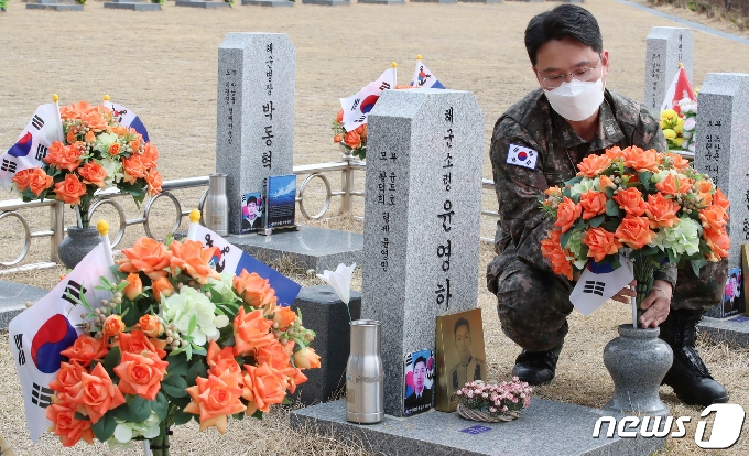 (대전=뉴스1) 김기태 기자 = 서해수호의 날을 이틀 앞둔 24일 대전 유성구 국립대전현충원 제2연평해전 전사자 묘역과 연평도 포격전 전사자 묘역에서 해군본부 장병들이 묘역을 정리하고 있다. 201.3.24/뉴스1