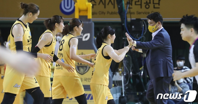 (청주=뉴스1) 김용빈 기자 = 13일 오후 충북 청주시 청주체육관에서 열린 KB국민은행 Liiv M 2020-2021 여자프로농구 청주 KB 스타즈와 용인 삼성생명 블루밍스의 챔피언 결정전 4차전에서 KB 안덕수 감독이 선수들을 격려하고 있다. 2021.3.13/뉴스1