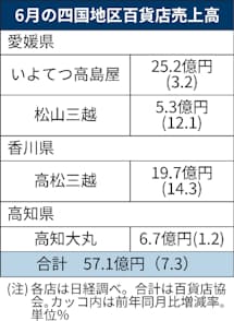 中四国百貨店協会が25日発表した四国地区の6月の百貨店売上高は、前年同月比7.3%増の57億1200万円だった。4カ月連続で前年実績を上回った。外出機会が増えたことなどから靴などの身の回り品や化粧品の販売が好調だった。ただ、足元では新型コロナウイルス禍の感染再拡大で個人消費が冷え込む懸念がある。