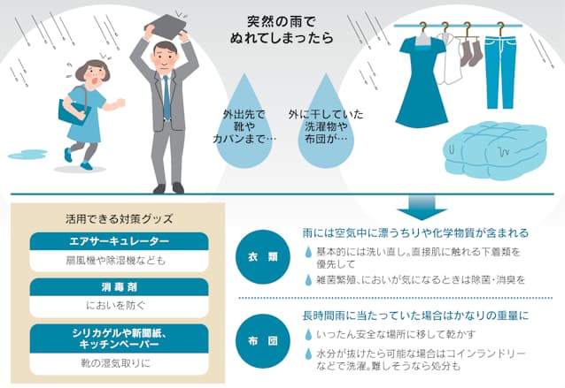 外出先での急な大雨には困ってしまう。身に着けている服や靴、カバンがぬれて帰宅後に一苦労。干しておいた洗濯物があれば途方に暮れる。どう対処したらいいか考えてみた。