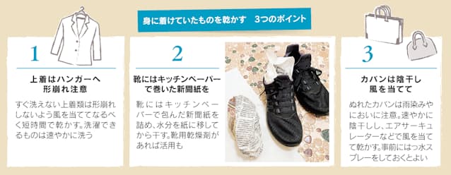まずは身に着けたまま雨にぬれてしまった衣類だ。着続けていれば健康を害しかねないので、帰宅したらもちろん速やかに脱ぐ。できればすぐに洗濯したいところだ。