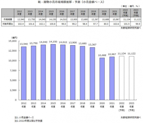 2022年度の国内靴・履物小売市場規模は、小売金額ベースで、前年度比101.5%の1兆1,134億円と予測した。2022年度以降も、コロナ禍による影響やそれにより生まれた新しい生活様式の定着、さらには原材料高騰に伴う製品価格上昇などの諸要因から大きな回復は見込めず、微増または横ばいに推移すると考えられる。