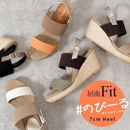 ベルト部分がゴム製で伸びるため、締め付けずにしっかりフィット。おしゃれなデザインで、7㎝のウエッジソールが歩きやすくスタイルもアップ!