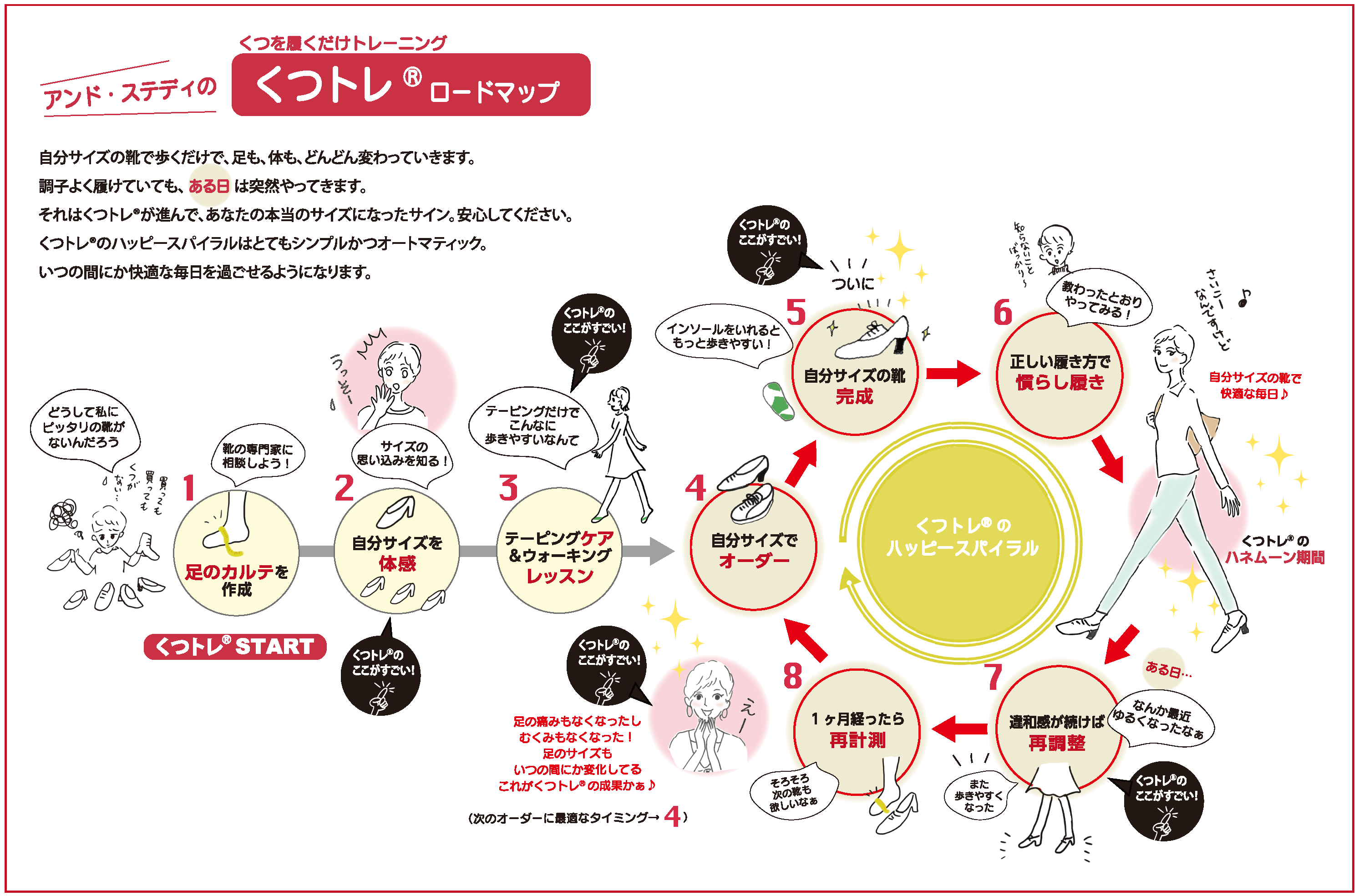 一方、「アンド・ステディ」サロンでは、全国から集う靴ジプシー6,800名以上からのお悩み解決を請け負い、足に合う靴づくりに必要なあらゆる機能を加えたサービスをまとめあげ、実用的な「くつトレ®」として、靴からはじめる体づくりを伴走しています。